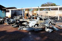 Garagem foi atingida por incêndio na noite de terça-feira, 7. Doze veículos ficaram destruídos. Dez deles contam com seguro