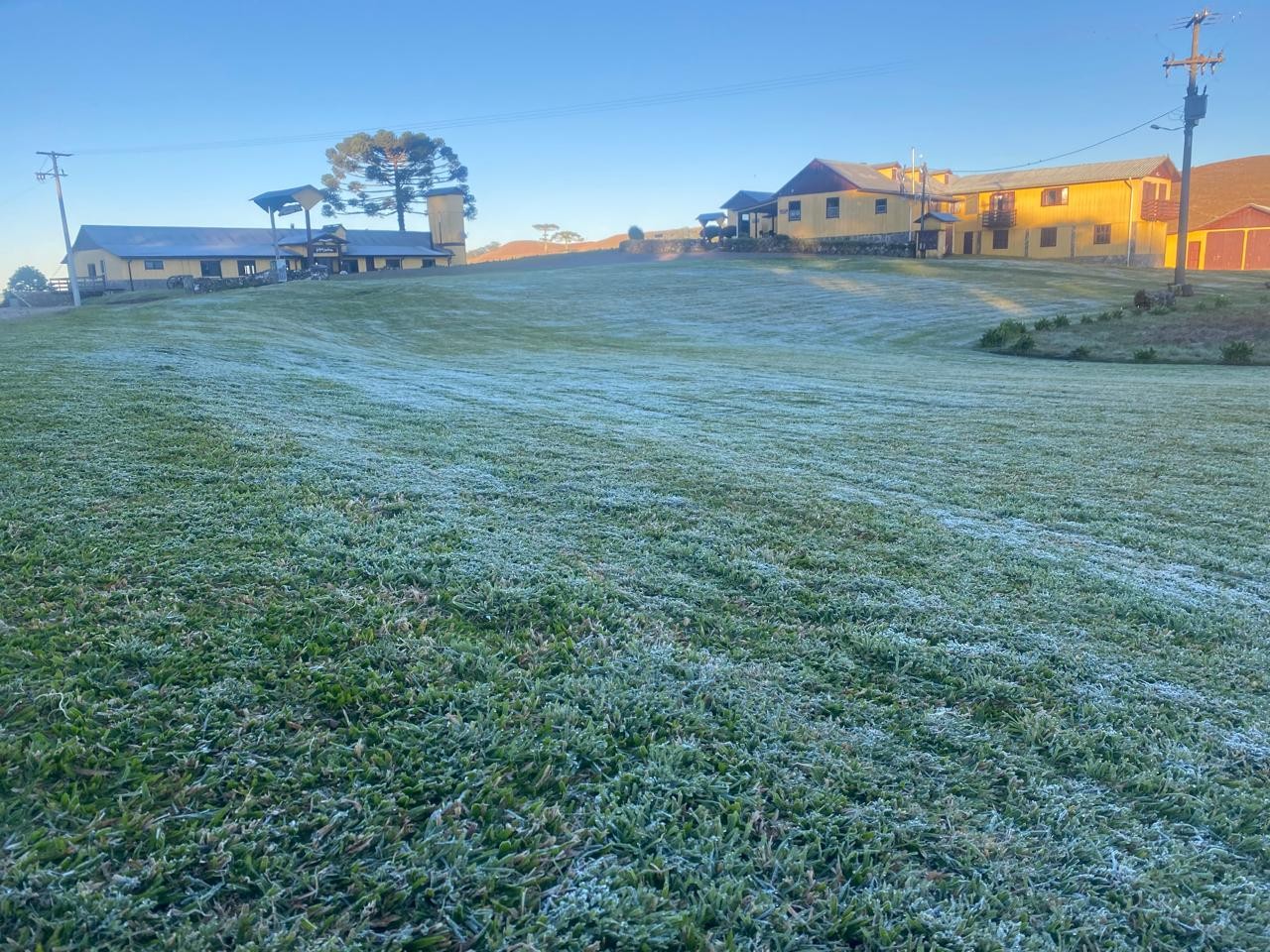 Em São José dos Ausentes, na Serra, o gramado de uma fazenda ficou coberto por uma fina camada de gelo. O município registrou 3,6ºC, conforme a Climatempo Meteorologia.