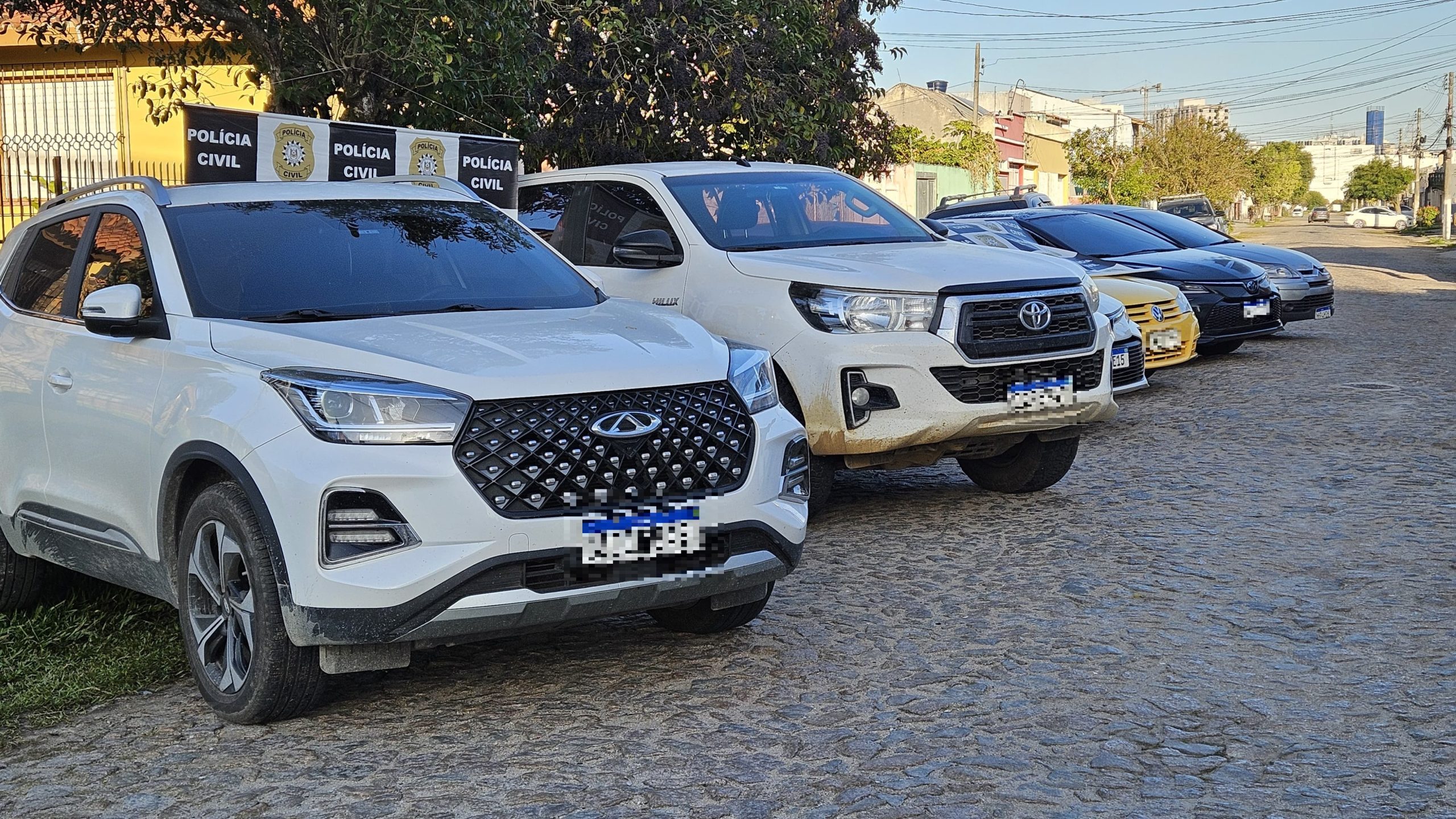 Carros apreendidos em operação em que a polícia fechou empresas suspeitas de lavar dinheiro obtido com golpe dos nudes no RS — Foto: Stéfane Costa/RBS TV