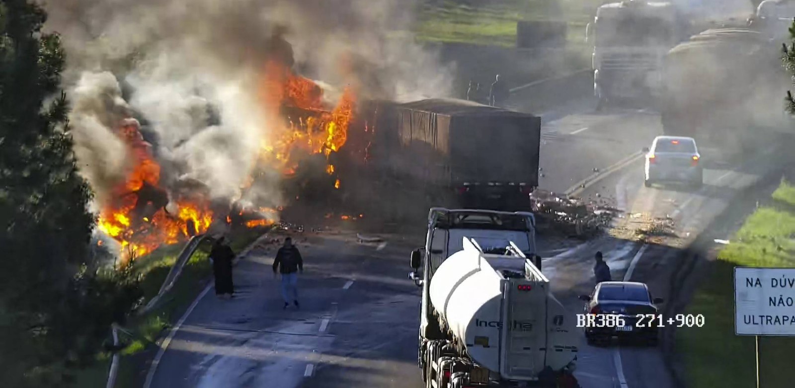 Colisão entre caminhões provoca incêndio e bloqueia trânsito na BR-386, em Fontoura Xavier