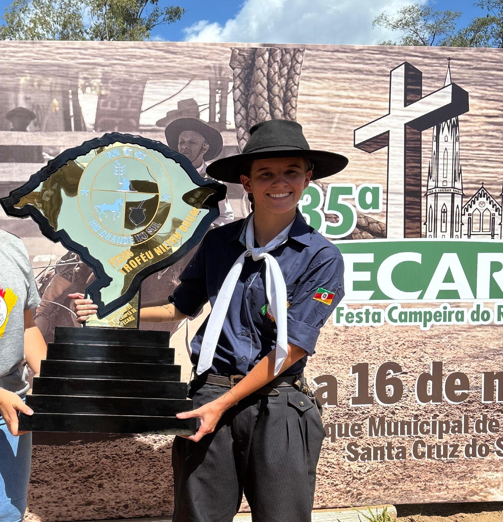 No ano passado, a seleção da 30ª Região Tradicionalista (Vale do Sinos), formada por ela e mais nove homens, venceu a Festa Campeira do Rio Grande do Sul. Assim, conquistou o direito de representar o estado no Rodeio Nacional dos Campeões. O torneio começou nesta quinta-feira (24) na cidade goiana, reunindo os vencedores de competições realizadas em federações tradicionalistas (MTGs), espalhadas pelo país, em 2024.