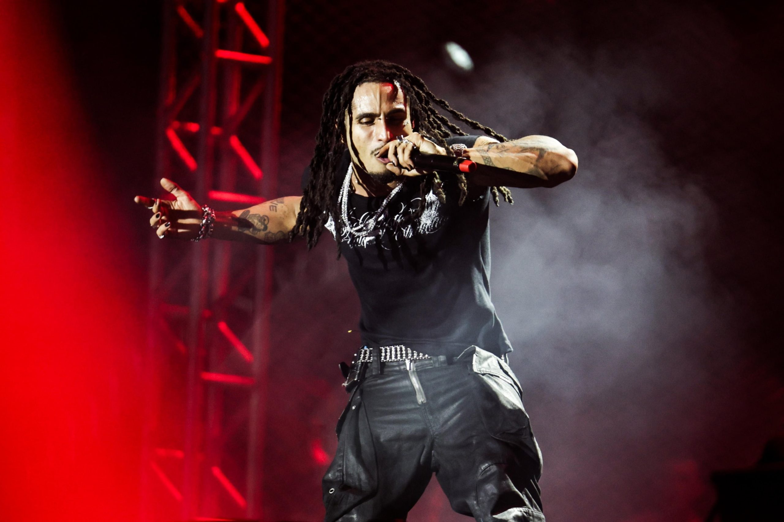 Com a lente de olho vermelha brilhando sob as luzes, todo de preto, calça com a boca aberta, colares tilintando, cueca aparecendo como elemento estético calculado, Matuê dominou o palco e o festival.