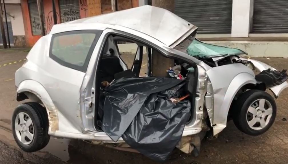 Mulher de 25 anos morre após colisão de carro com poste em São Leopoldo; VÍDEO mostra veículo destruído