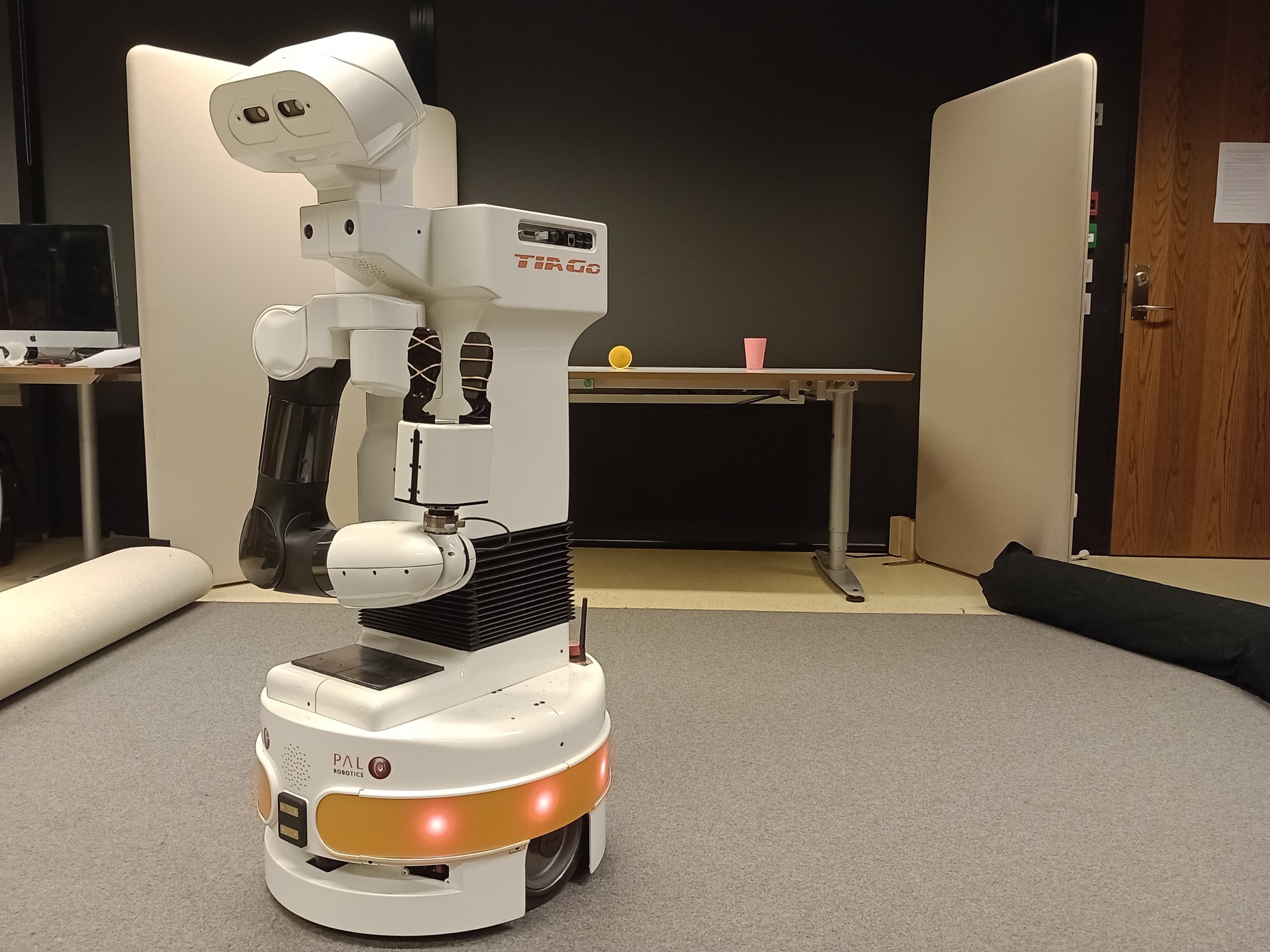 Durante o período de um ano que passou na Noruega, Letícia testou sua proposta com o robô real em laboratório. O espaço de testes simulava um ambiente doméstico de cerca de cinco metros quadrados, com dois copos no chão e uma mesa.