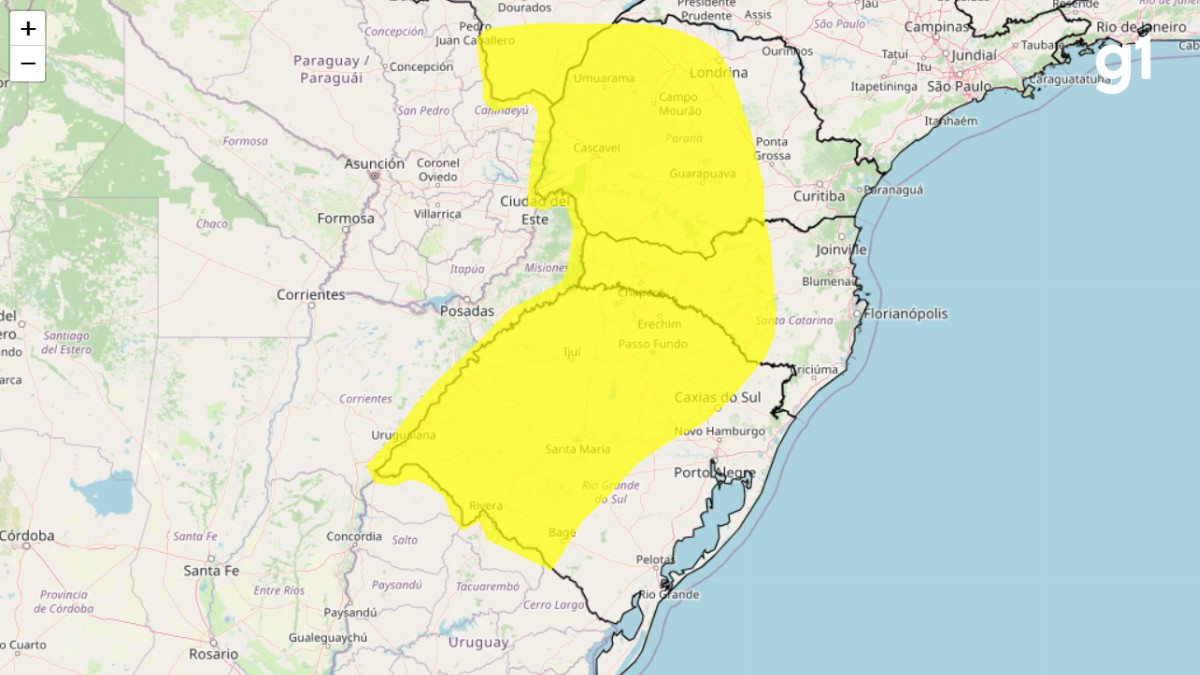 O Instituto Nacional de Meteorologia (Inmet) emitiu um aviso de perigo potencial por tempestades válido até o final da manhã da terça-feira. O alerta aponta chance de chuva entre os 20 e 30 milímetros por hora, podendo alcançar até 50 mm ao longo do dia. Também há previsão de ventos intensos, entre 40 a 60 km/h, e queda de granizo. As regiões Central, Noroeste, Sudoeste, Nordeste e parte da Serra estão entre as áreas mais afetadas (veja o mapa abaixo).
