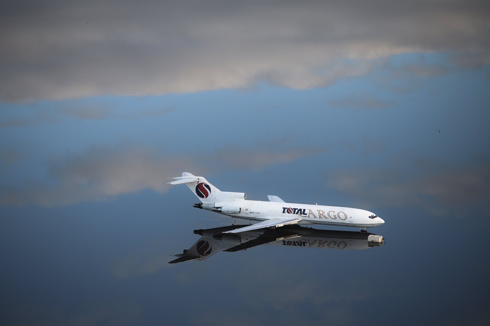 A imagem que leva o título “Aeronave em pista inundada”, mostra um Boeing 727-200 encalhado na enchente, com o céu de nuvens refletido na água, criando uma ilusão de ótica.