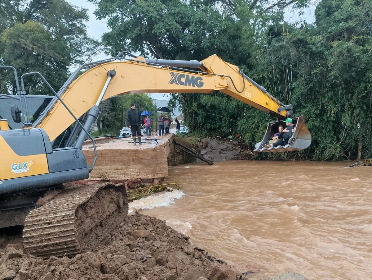 Foi por meio de uma pá de uma escavadeira hidráulica que a técnica em enfermagem Mônia Emília Dumke da Silva, de 42 anos, e o enfermeiro Djunior Dumke Abich, de 24, puderam passar pelo local onde houve a queda da cabeceira de uma ponte, na RS-502, localidade da Vila Paraíso.