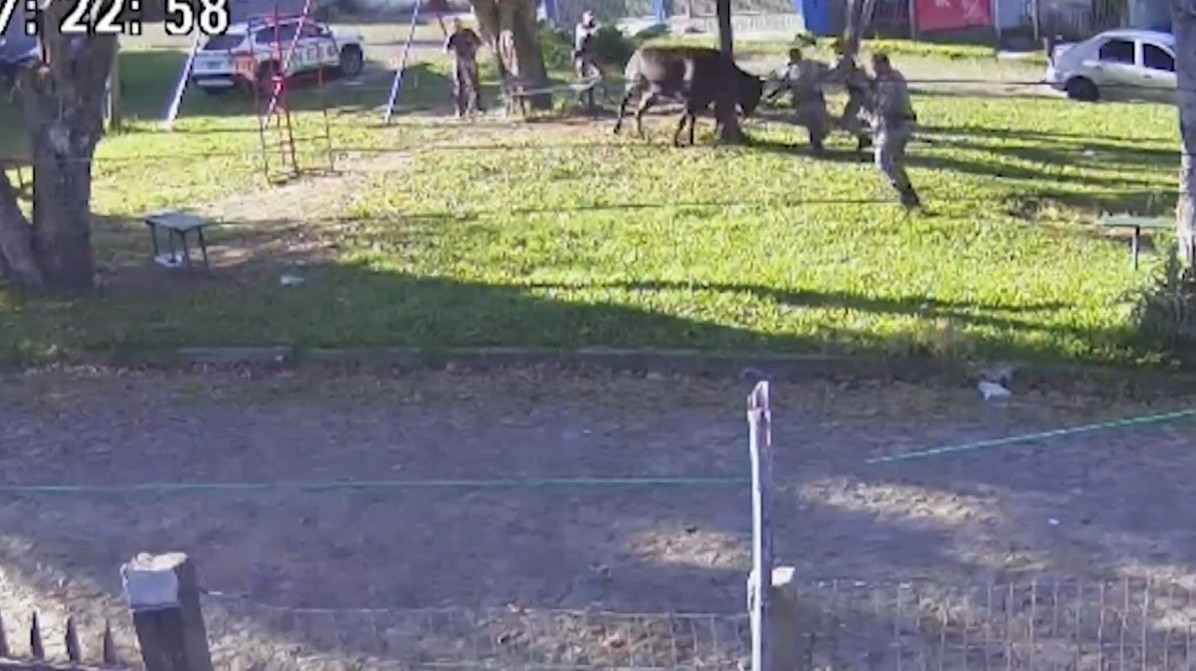 Um touro que estava solto em uma rua de Porto Alegre atacou policiais militares (PMs) e feriu um deles. A situação foi registrada em vídeo por uma câmera de segurança de uma casa da Avenida Nilo Wulff, no bairro Restinga, na quarta-feira (5). Veja o vídeo acima.
